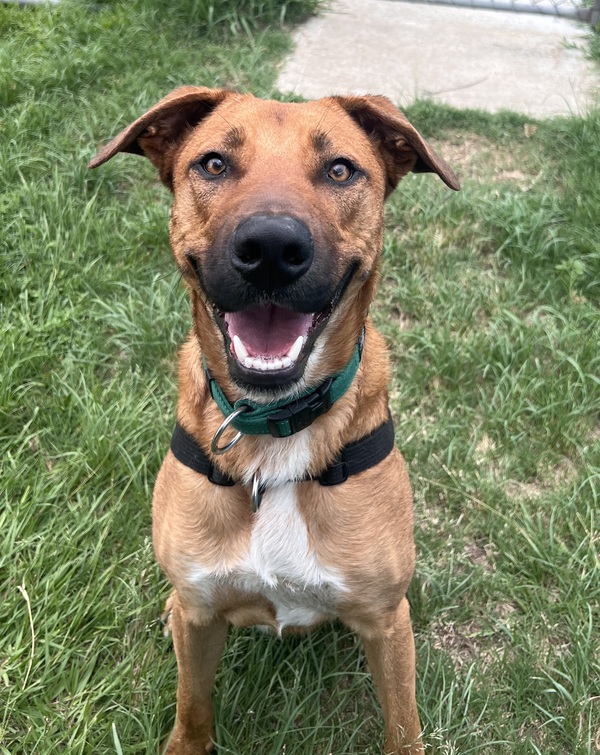 He's a big, bouncy youngster who doesn't always know his size, so the whole family must be involved in his continued training. He should be the only dog in the home for now, and all family members must meet him at adoption.
