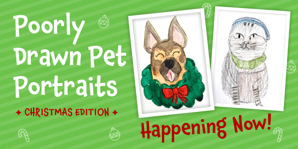 Wednesday 4th AND Thursday 5th December you can have your very own genuine-paw-quality Poorly Drawn Pet Portrait, Christmasified for the Christmas season